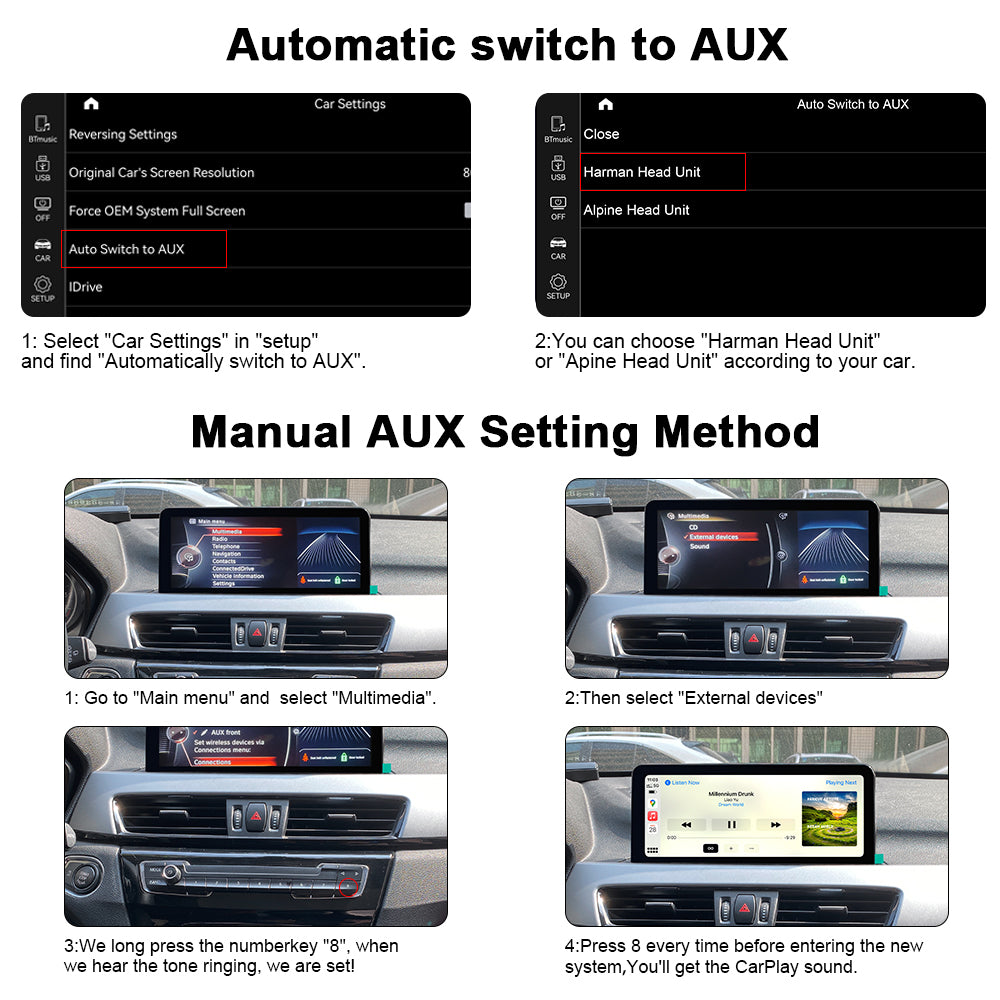 1. You can set auto AUX mode, when switch to CarPlay or Android auto, the sound will be switched automatically. Please select the correct factory host brand(Harman or Alpine).