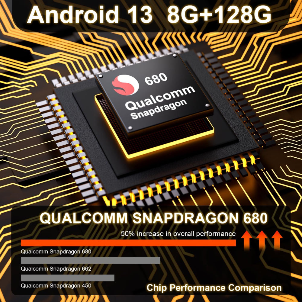 Powered by Qualcomm Snapdragon 680/685 chip with 6nm process, 8-core processor. Android 13 Version. 8GB of RAM with 128GB of ROM, DDR4 Emmc UFS 2.2 can handle multitasking quickly without lagging.