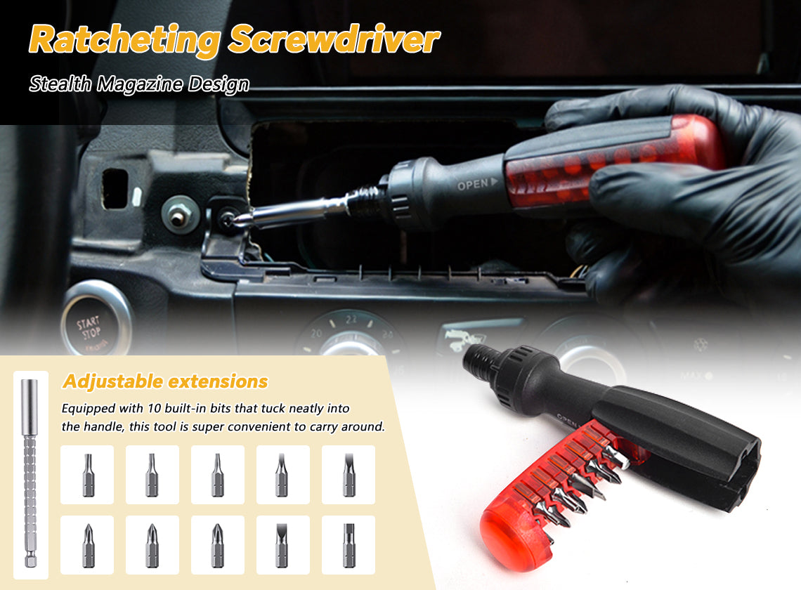 Stealth Magazine Design-The bits can be neatly stored inside the handle for easy portability. Adjustable extensions-Adjustable to multiple lengths for versatile use in various scenarios. 10 detachable bits-Compatible with most automotive screws, suitable for removing screws from all vehicle models.