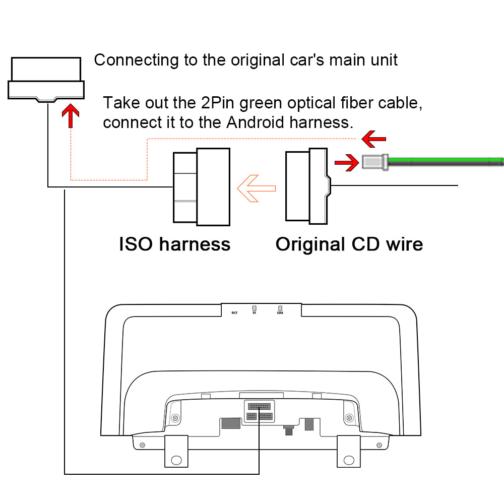 11. B-1: If the OEM screen still doesn't display properly or you can't hear the FM sound, you need to check if there is a fiber optic cable on the plug of the OEM ISO harness, and if there is, you need to transfer it to the PEMP ISO harness.