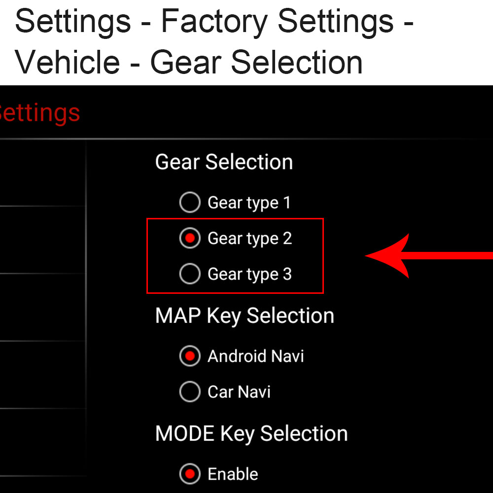23. If you have a Qualcomm 662/8953 screen, the setup path is Settings - Factory - 070305 - Vehicle - AUX Switching Modes.