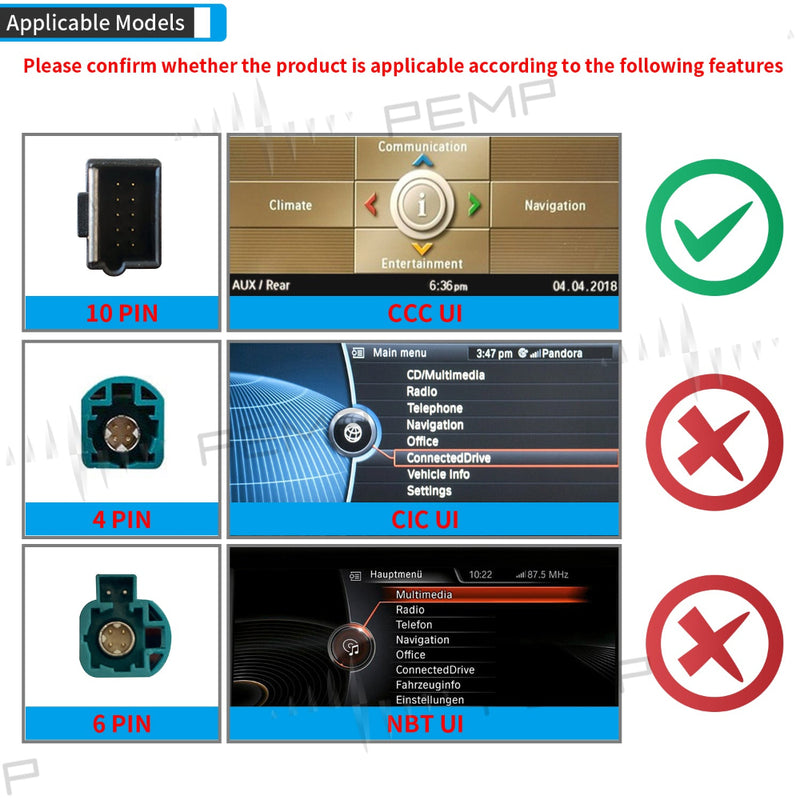 1. Only suitable for BMW CCC original car 10PIN LVDS system. Not suitable for CIC system.