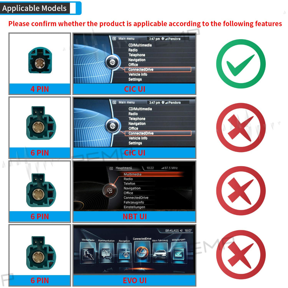 1. Only suitable for BMW CIC original car 4PIN LVDS system. Not suitable for CCC system.