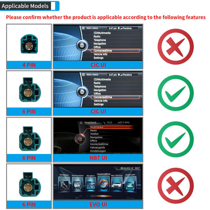 1. Only suitable for BMW NBT original car 6(4+2)PIN LVDS system. Not suitable for EVO system.