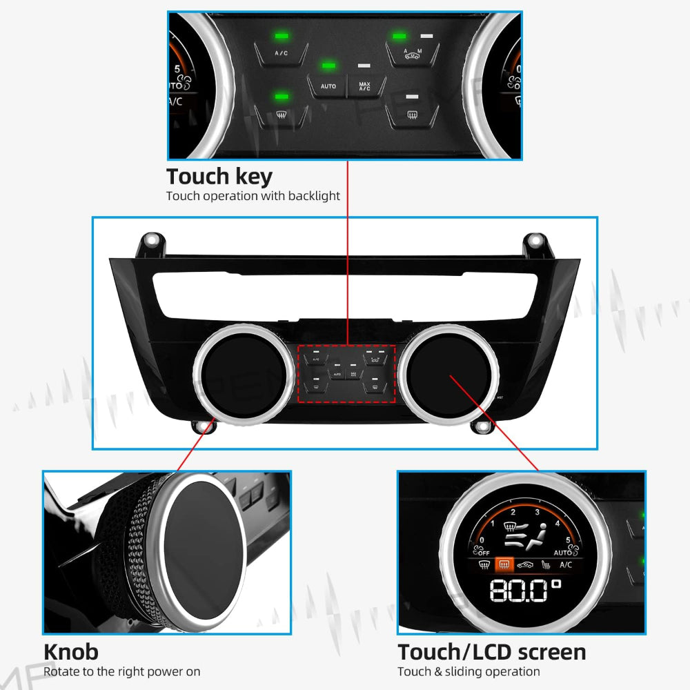 1. you can use the left and right slide to adjust the temperature, air volume, ambient light color; ambient light you can also click the corresponding color to adjust. 2. you can click on the touch screen to adjust the blowing mode, seat heating temperature size.