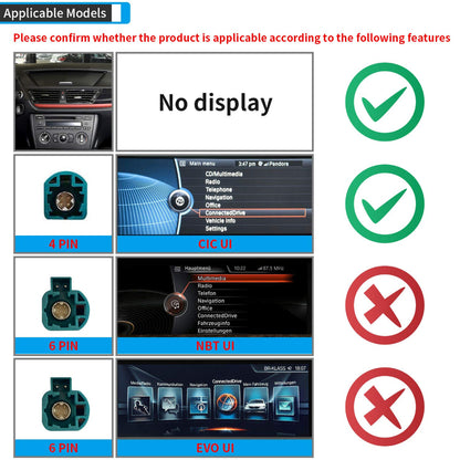 1. Only suitable for BMW CIC original car 4PIN LVDS system and the original car without screen. Not suitable for NBT system.