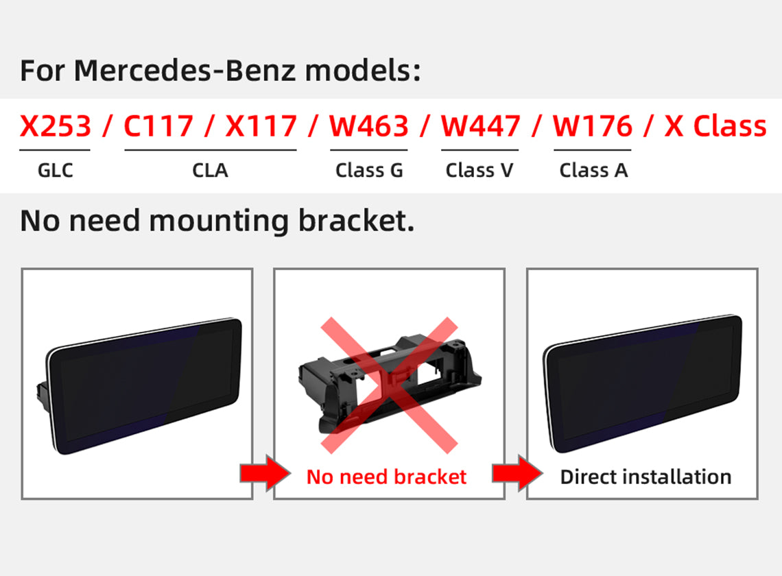 If you are installing GLC(X253 ) CLA(C117 X117) CLASS G ( W463) GLASS V( W447) CLASS A( W176 ) X CLASS, you don't need the installation bracket in the box. You will need to use the mounting brackets from the original car.