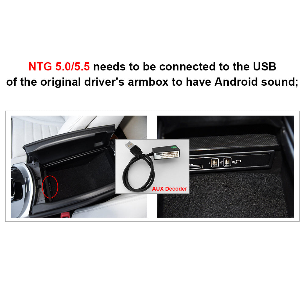 Because NTG5.0 has no aux input interface. You need to input Android audio from the USB port of the OEM USB. Then connect the Android 3.5mm audio cable between the USB audio box and the Android harness.