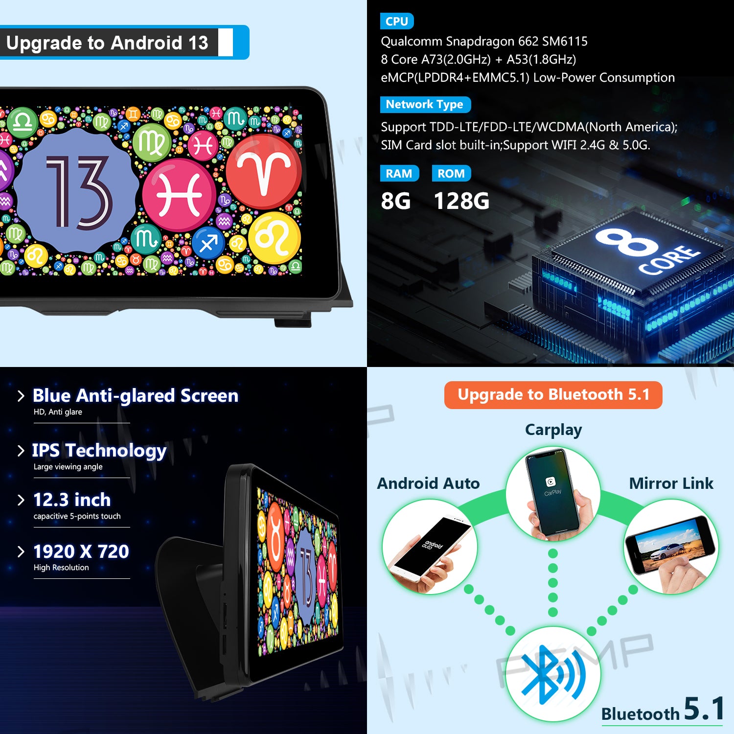 4. Multi-Point Capacitive Touch Screen, 12.3 HD IPS Display Screen, Resolution Up To 1920 * 720; Matching With PEMP AHD Reversing Camera, The Reversing Picture Will Be Very Clear.