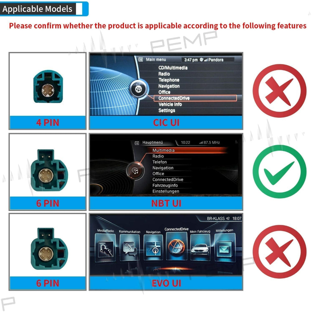 1. Only suitable for BMW NBT original car 6PIN LVDS system. Not suitable for EVO system.
