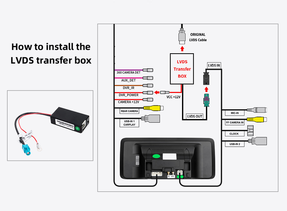 If your car is an NTG 4.0 system, you need to connect our equipped LVDS box with the original LVDS cable. This allows access to the OEM interface. How to connect the LVDS box? 1. Use the “VCC+12V” on the LVDS box to connect the “DVR_POWER” on the ISO cable. 2. Use the “LVDS OUT” on the LVDS box to connect the “LVDS IN” on the RCA cable. 3. Use the original LVDS cable to connect the holes at the top of the LVDS box.