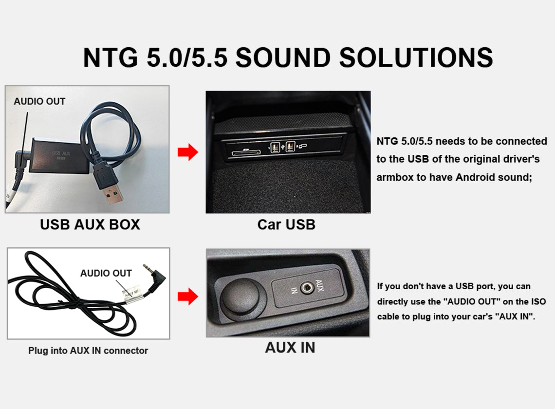 NTG 5.0/5.5 needs to be connectedto the USB of the original driver'sarmbox to have Android sound