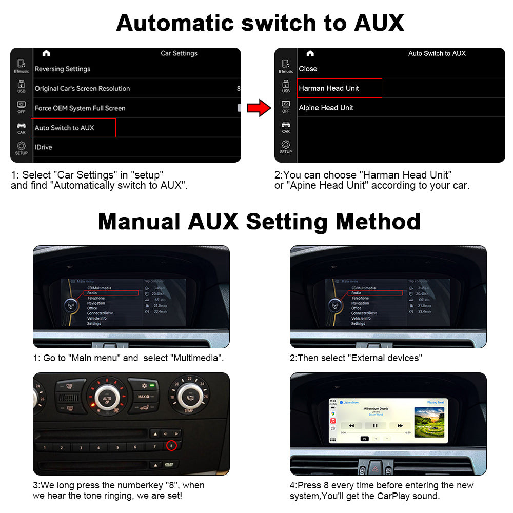1. You can set auto AUX mode, when switch to CarPlay or Android auto, the sound will be switched automatically. Please select the correct factory host brand(Harman or Alpine). 2. You can also store the AUX mode in the 8 button, and every time you press the 8 button before entering a new system, you can get the sound of Carplay or Android auto.