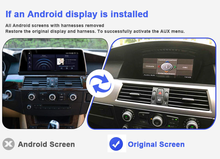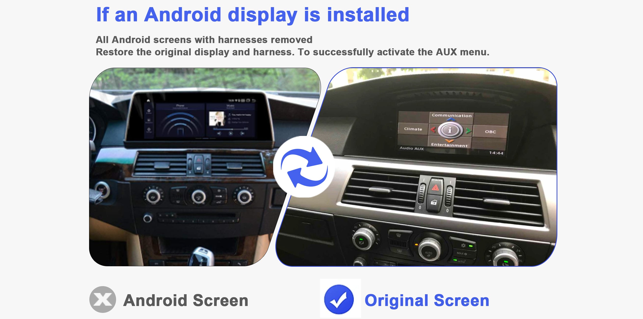 If you have an Android screen installed, Please remove the Android screen and wiring harness. Leave it in the same state as before installation. Activate the AUX menu first. Then reinstall the Android screen. Otherwise you will not get the AUX menu.