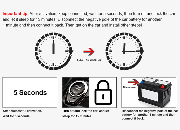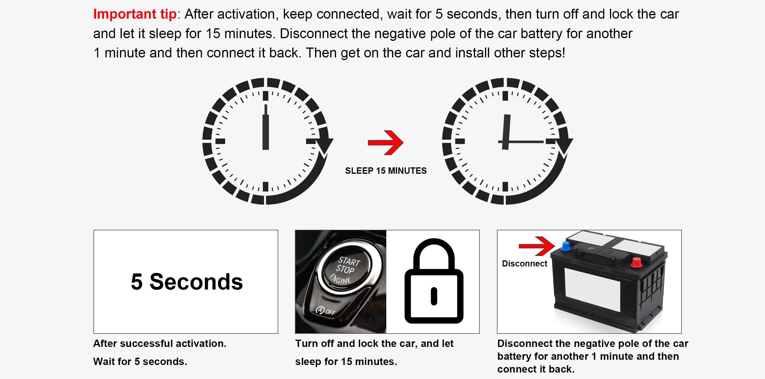 (important tip):After activation, keep connected, wait for 5 seconds, then turn off and lock the car and let it sleep for 15 minutes. Disconnect the negative pole of the car battery for another 1 minute and then connect it back. Then get on the car and install other steps!