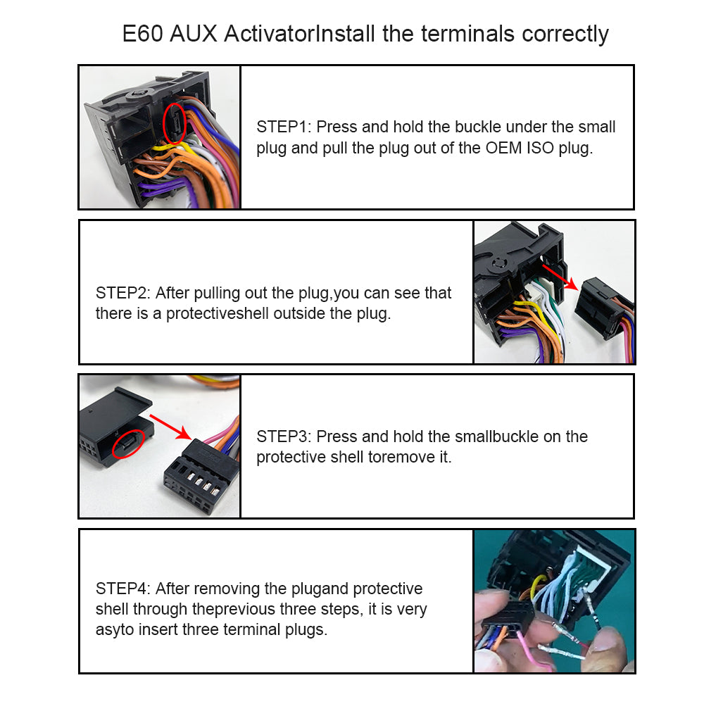 * If you're going to install an Android screen, make sure you don't install these three red, white and black wires! Steps in connecting the red, white and black three wire terminals: 1- Take the big plug of the OEM ISO out of the back of the radio; 2- Take the 1st socket out of the big ISO plug; 3- Take the 2nd socket out of the 1st socket; 4- Insert the red, white and black terminals into the second socket; 5- Return the second socket and the first socket to the large ISO socket; 6- Plug the big ISO socket back into the back of the OEM radio; This way you can get the sound of AUX.