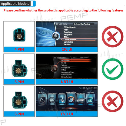 1. Only suitable for BMW NBT original car 6(4+2)PIN LVDS system. Not suitable for EVO system.